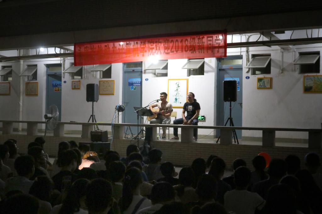 来自永康吉他社的02级学长为同学们演唱了《夜空中最亮的星》、《海阔天空》、《曾经的你》等经典歌曲,歌声优美动人,令在场的观众们陶醉其中。演出过半,不少新生踊跃举手上台演唱歌曲,尽管带有一丝紧张,但还是享受着这个舞台,让我们深深的感受到了新生的活力与热情。