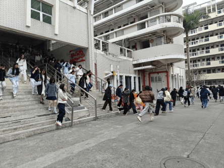 随着警报响起,模拟火情发生后,学生迅速采取“伏地、掩护、抓牢”的紧急避险动作,用湿毛巾捂住口鼻,低姿快速通过疏散通道,随后在辅导员、志愿者和安保人员的指引下沿指定路线撤离。最终,全体师生在西区田径场完成集结,无一人滞留。