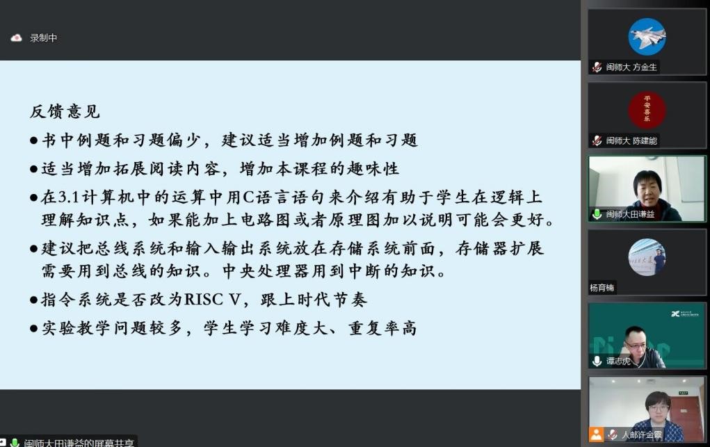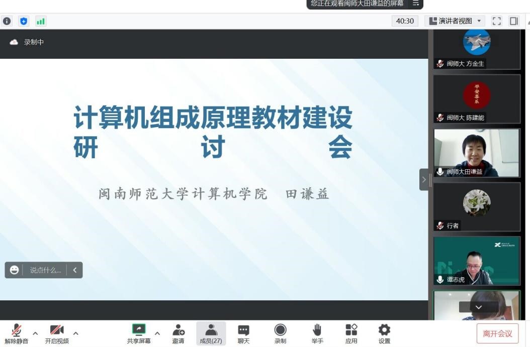 2023年2月28日下午,应人民邮电出版社邀请,bat365在线中国官网登录入口网络工程系计算机组成原理课程组教师参加由人民邮电出版社主办的题为“讨论应用型本科院校“计算机组成原理”教材建设方案”的线上研讨会。会上华中科技大学bat365在线中国官网登录入口院长谭志虎教授针对《计算机组成原理 微课版》教材做了详细的介绍。网工系的田谦益老师在会上做了发言,针对近三年的课程教学及教材使用情况进行了详细的介绍并和与会老师分享了教学经验,发言得到了与会老师的肯定。与会各高校的老师在计算机组成原理课程的课程目标、实验、课程思政、工程认证等问题进行了深入探讨和交流。