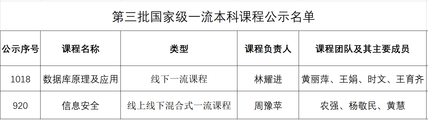 近日,教育部高等教育司发布了《关于第三批国家级一流本科课程认定结果的公示》,bat365官网林耀进教授负责的线下课程《数据库原理及应用》和周豫苹教授负责的线上线下混合课程《信息安全》入选国家级一流本科课程。