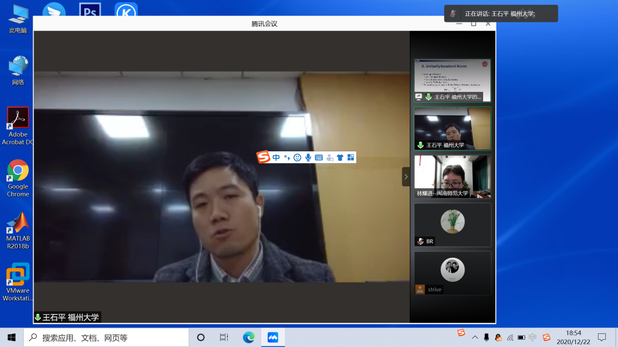 12月22日晚上,福州大学王石平教授应邀为bat365官网师生作题为“Differentiable Distance Metric Learning and Low-rank Recovery(可微分的距离度量学习和低秩恢复)”的线上讲座,讲座由赵红老师主持,部分相关专业的老师及全体研究生出席并认真听取了本次讲座。