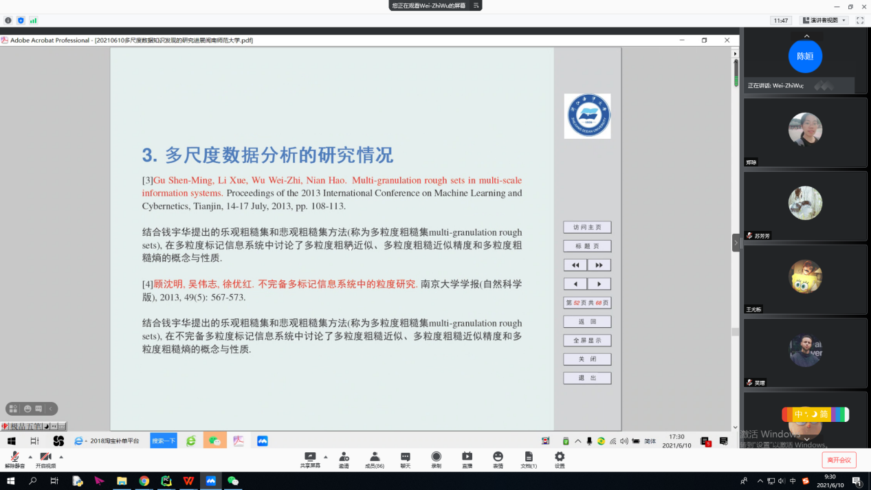6月10日下午,浙江海洋大学吴伟志教授应邀为bat365官网师生作题为“多尺度数据知识发现的研究进展”的线上专题讲座。讲座在林耀进院长和吴教授轻松的交谈中开始,林院长对吴教授的研究领域和相关研究成果进行了简单的介绍。