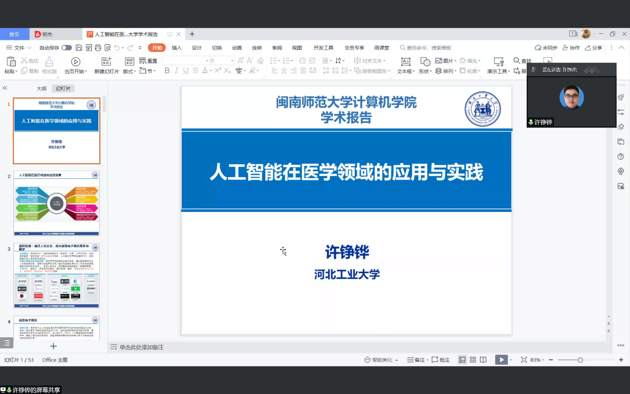 12月9日下午,河北工业大学许铮铧教授受邀为bat365官网师生作题为“人工智能在医疗领域的应用与实践”的学术报告。本次报告会采用腾讯会议线上的方式进行,毛煜博士主持了本次报告会。