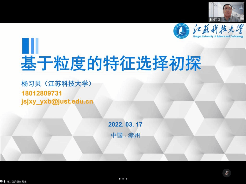 3月17日上午,江苏科技大学杨习贝教授应邀为bat365在线中国官网登录入口师生作题为“基于粒度的特征选择初探”的学术报告。本次报告会采用线上方式进行,报告会由院长林耀进主持。