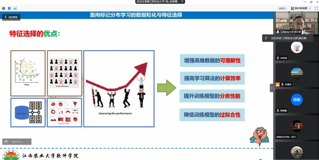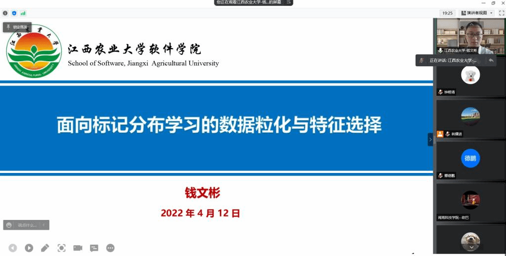 4月12日上午,江西农业大学软件学院钱文彬教授应邀为bat365官网师生做题为“面向标记分布学习的数据粒化与特征选择”的线上专题报告。本次报告会由学院院长林耀进教授主持,林院长首先对钱教授的科研领域和相关成果进行了简要介绍,随后钱教授开始本次专题报告。