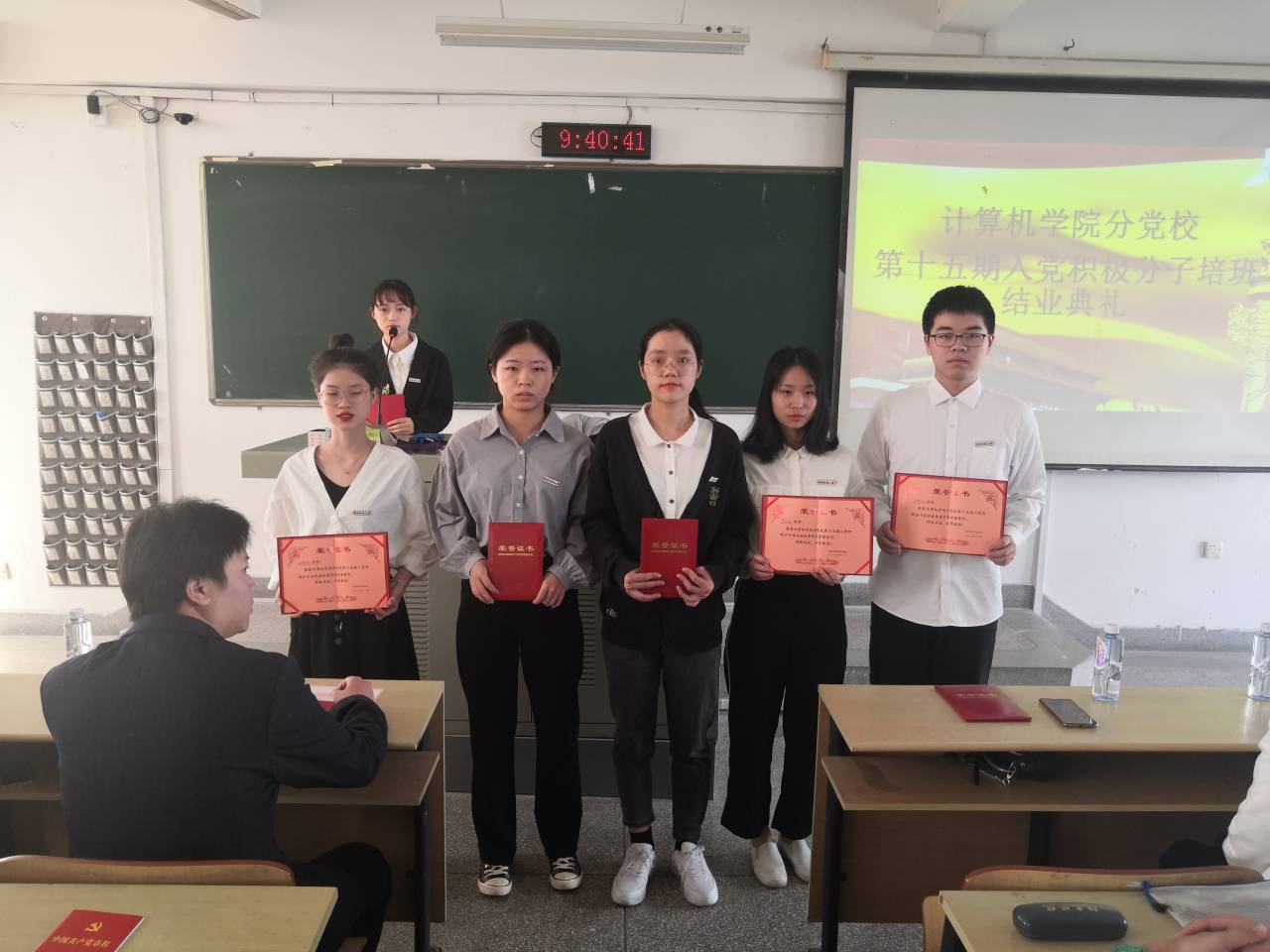 典礼共分七个议程进行。典礼在庄严的国歌声中拉开了序幕。首先,由张兴旺老师宣读结业文件,他同时祝贺九十八名学员顺利结业。其次,由朱鹏春老师宣读表彰文件,并向范靖豪等十名荣获本期培训班优秀学员称号的学员表示祝贺,同时,他希望学员们以优秀学员为榜样,戒骄戒躁、砥砺前行。接着,由林小芸老师、黄明芳老师、朱鹏春老师、李初妙老师、张兴旺老师为学员代表以及优秀学员们颁发结业证书和优秀学员荣誉证书。随后,优秀学员代表龚万源同学现场做了本期分党校成果展示,学员们跟随着大屏幕回顾了在分党校培训班学习和实践的过程。最后,由林小芸老师作总结发言,她嘱咐学员们不要辜负党组织的教诲和期望,坚定理想信念,不断提高自身综合素质。